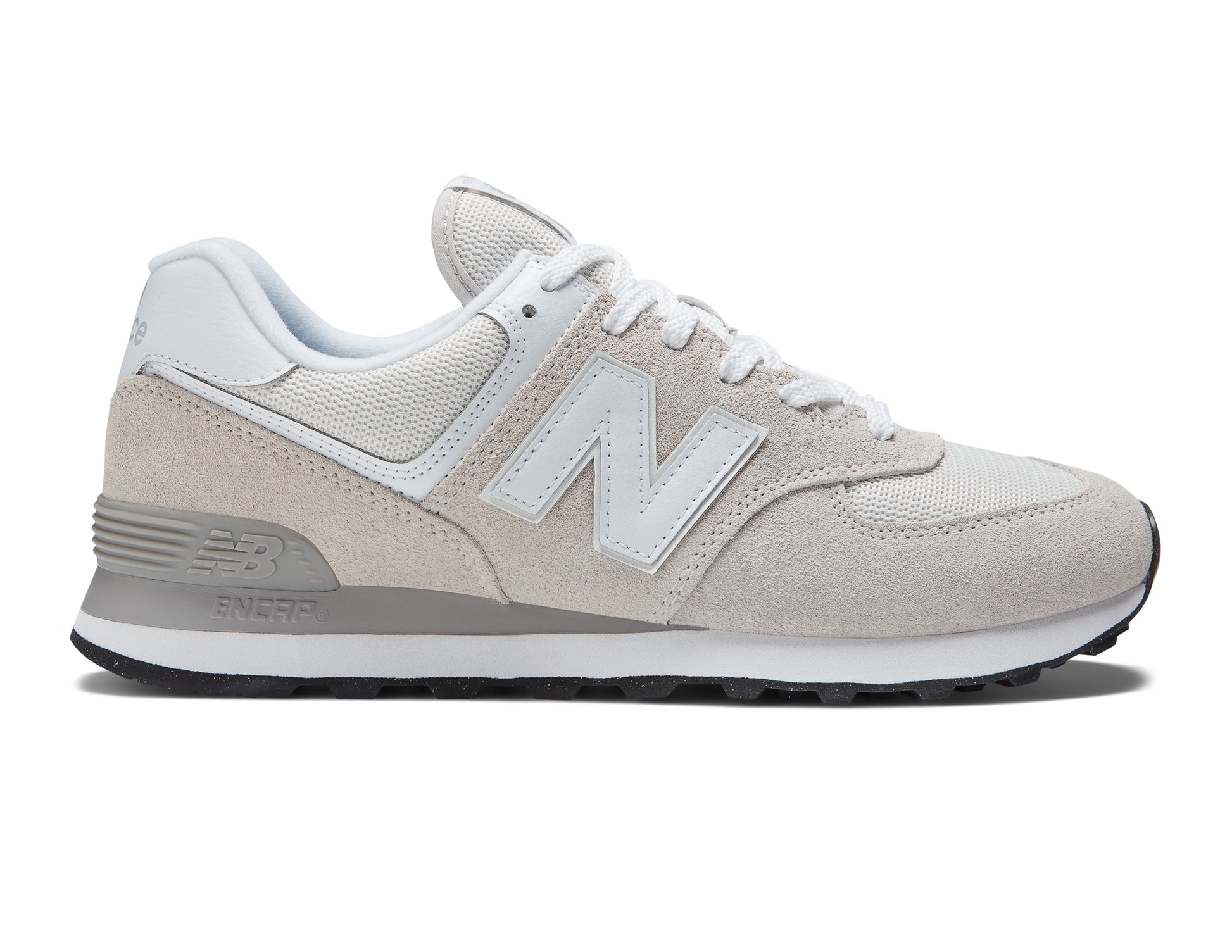 The New Balance 574 Nimbus Cloud 2022 comes in white, grey, and an off-white called nimbus cloud. The shoe has a nimbus cloud leather upper. It also has white leather and mesh sections on the upper part of the shoe. The shoe also features the New Balance logo on both sides of each shoe. Finally, it has a rubber sole with a white mid-section and a black lower finish.